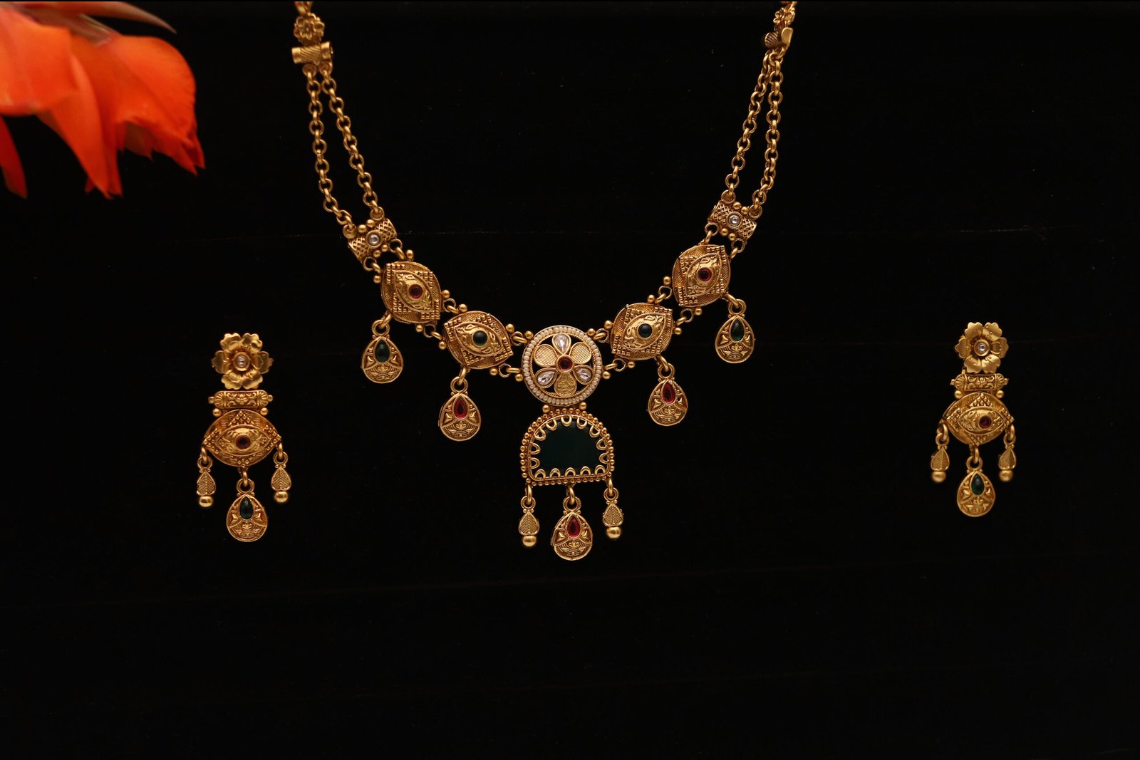 Embrace timeless tradition with the Antique Temple Grace Necklace Set, a masterpiece inspired by classic South Indian artistry. Crafted with intricate gold-toned detailing and adorned with green and ruby stones, this piece reflects the divine charm of temple jewelry. Perfect for festive occasions, weddings, and cultural celebrations.