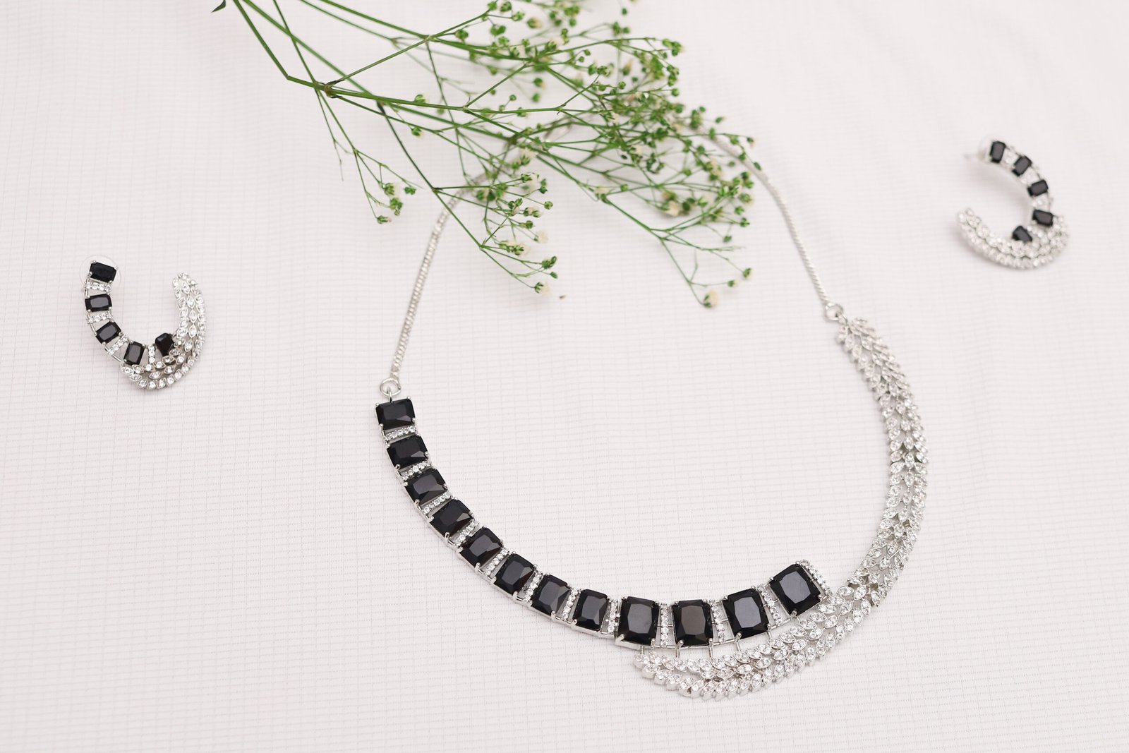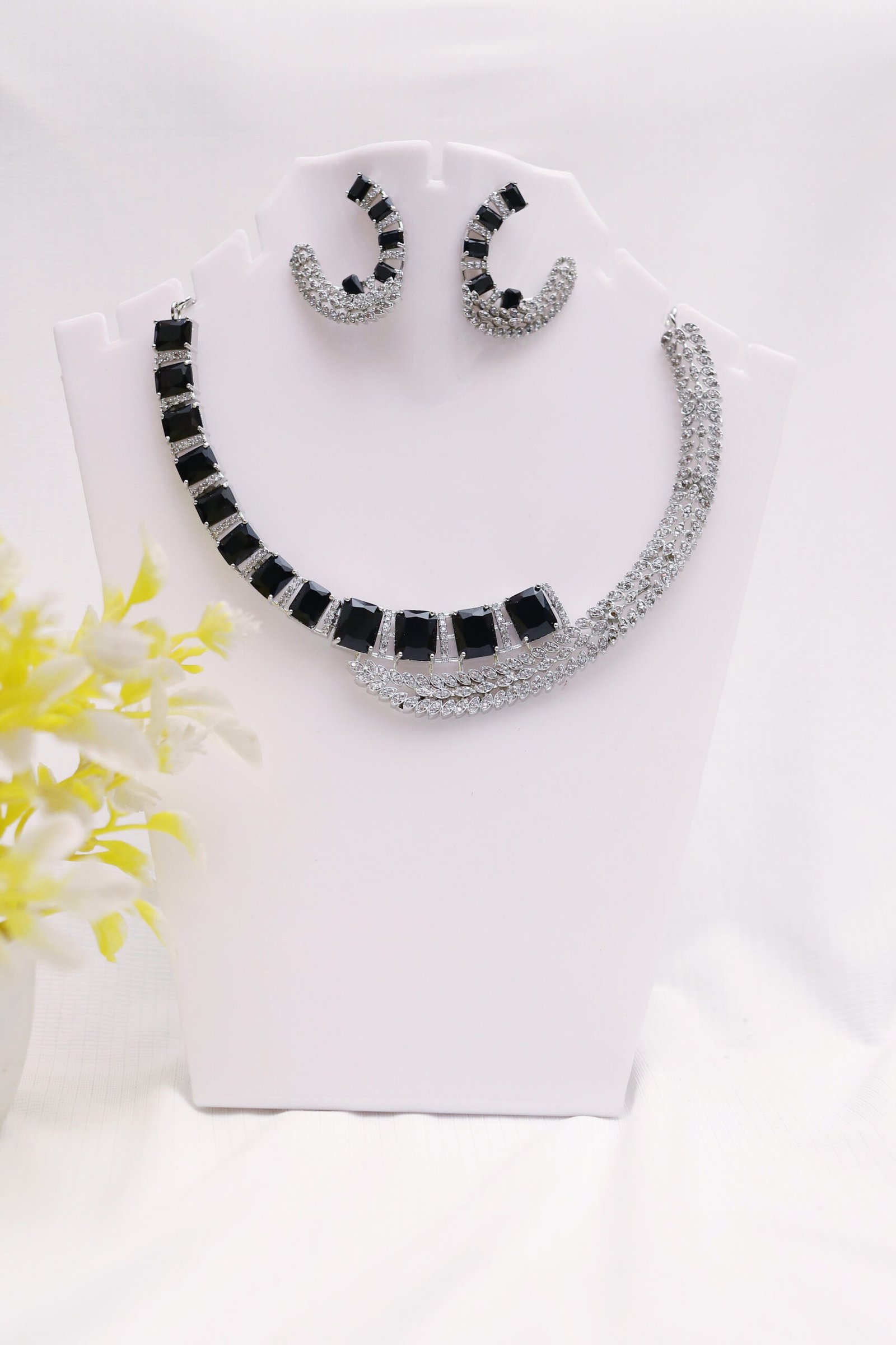 The Black Onyx Diva Jewelry Set Product Details:s striking black stones paired with radiant diamond-style crystals, creating a perfect balance of sophistication and glamour. Its sleek geometric design adds a contemporary edge, making it ideal for evening parties, receptions, and fashion-forward occasions.