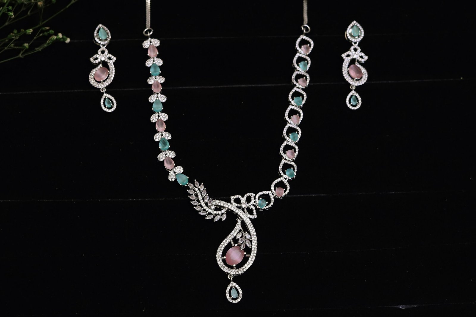 Soft, graceful, and uniquely stylish — the Blossom Harmony Pastel Necklace Product Details:s enchanting pastel pink and mint-green teardrop stones, paired with shimmering crystal detailing. The artistic floral-and-leaf motif adds a fresh feminine elegance, perfect for both traditional and modern outfits.