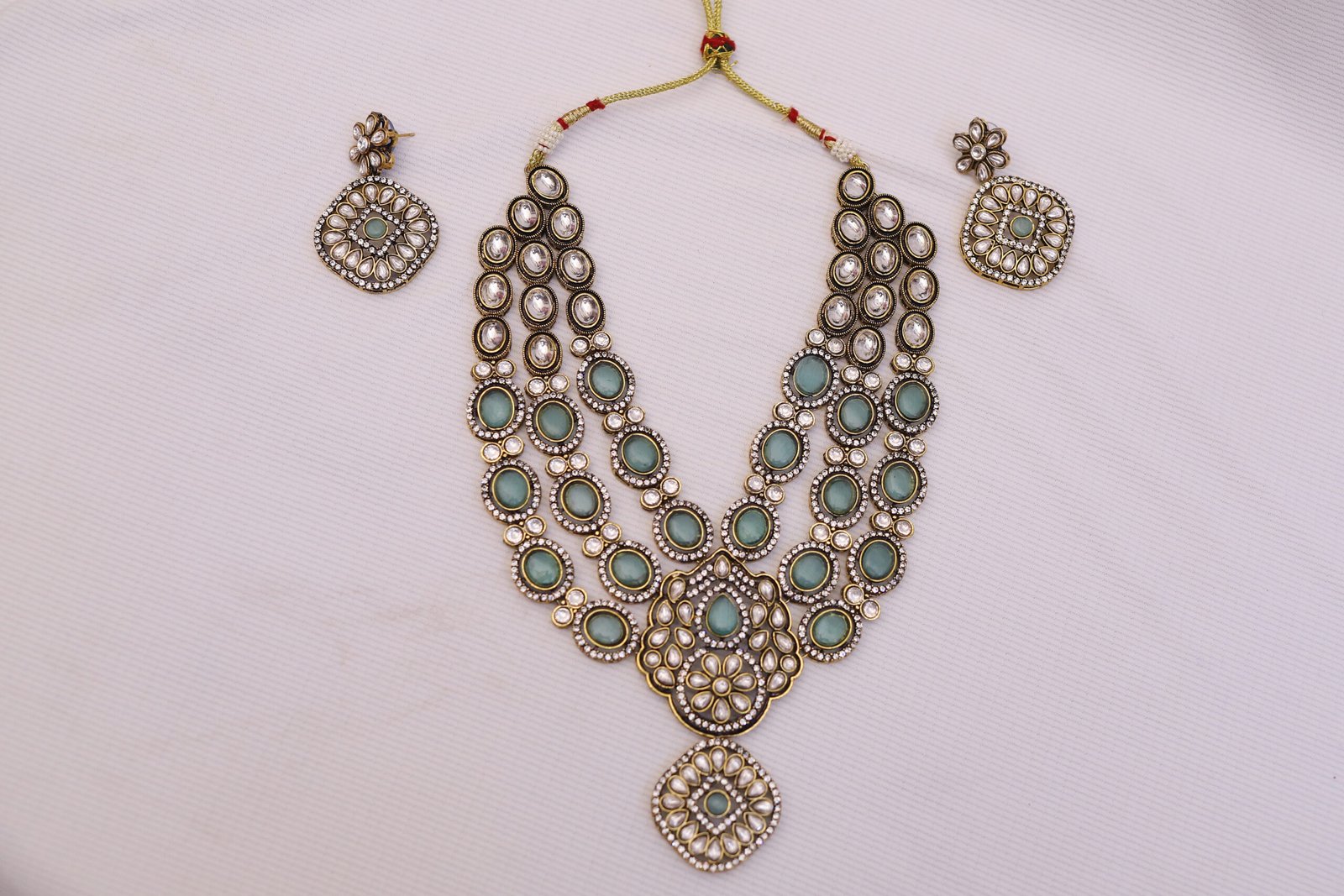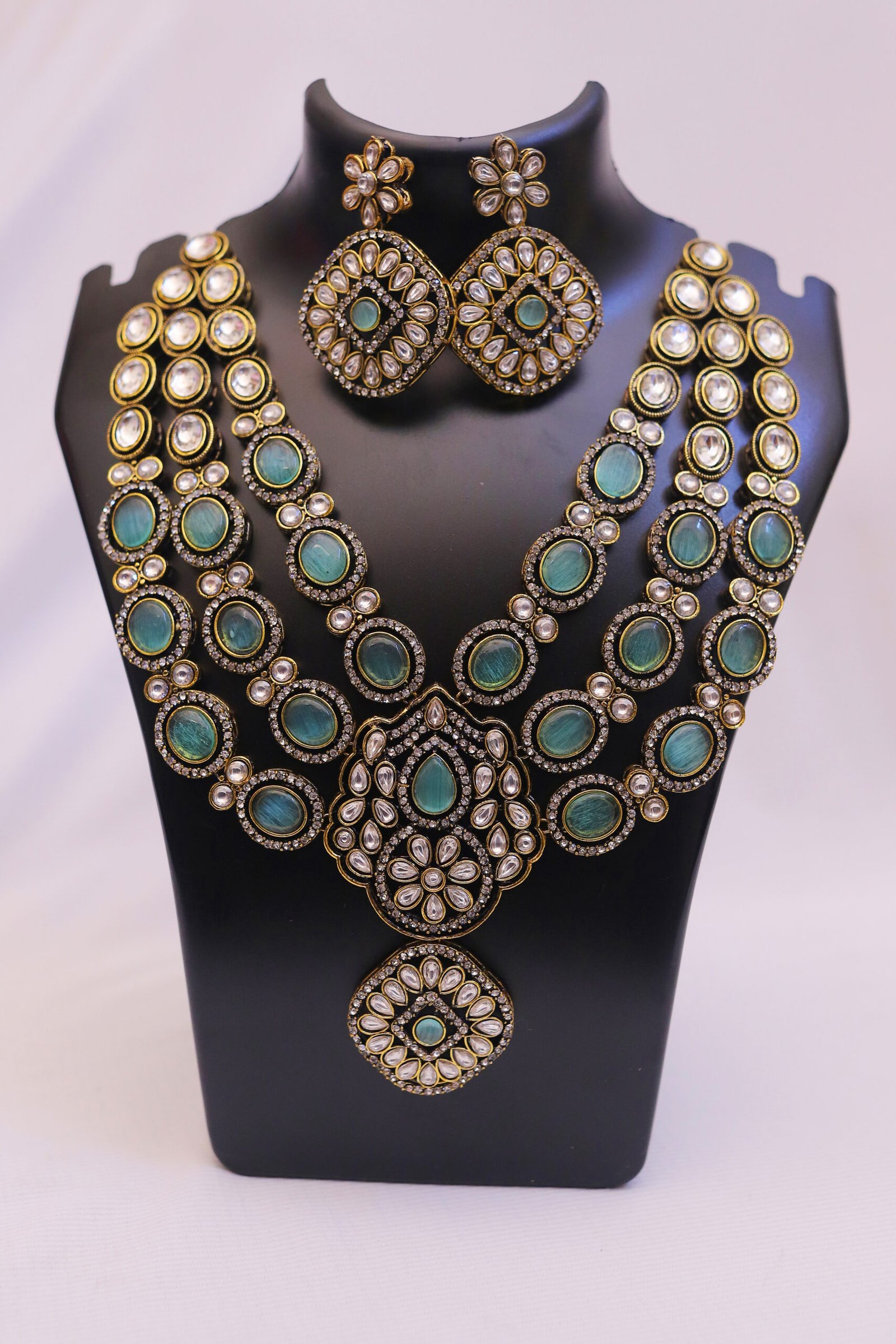 - Color: Antique gold tone with emerald teal stones and Kundan crystals