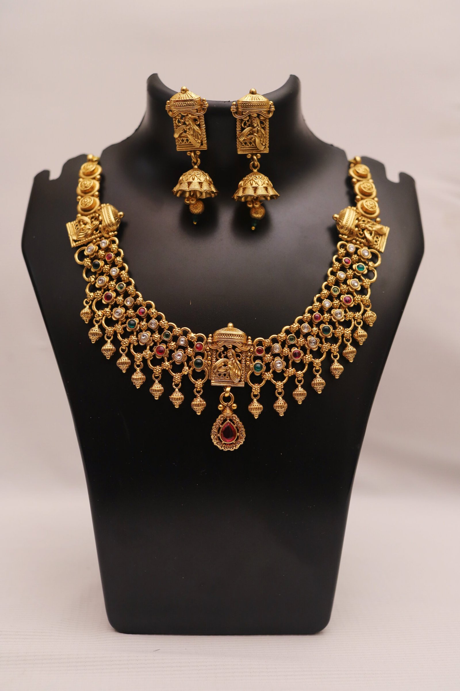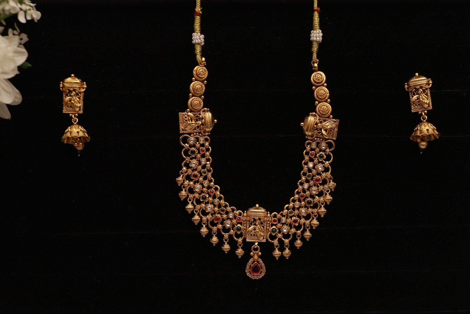 Celebrate divine beauty with the Heritage Lakshmi Temple Necklace Set, an exquisite piece inspired by timeless South Indian craftsmanship. Featuring a detailed Lakshmi motif, adorned with green and ruby stones, and paired with intricate jhumka earrings — this set brings an aura of grace and prosperity to every occasion.