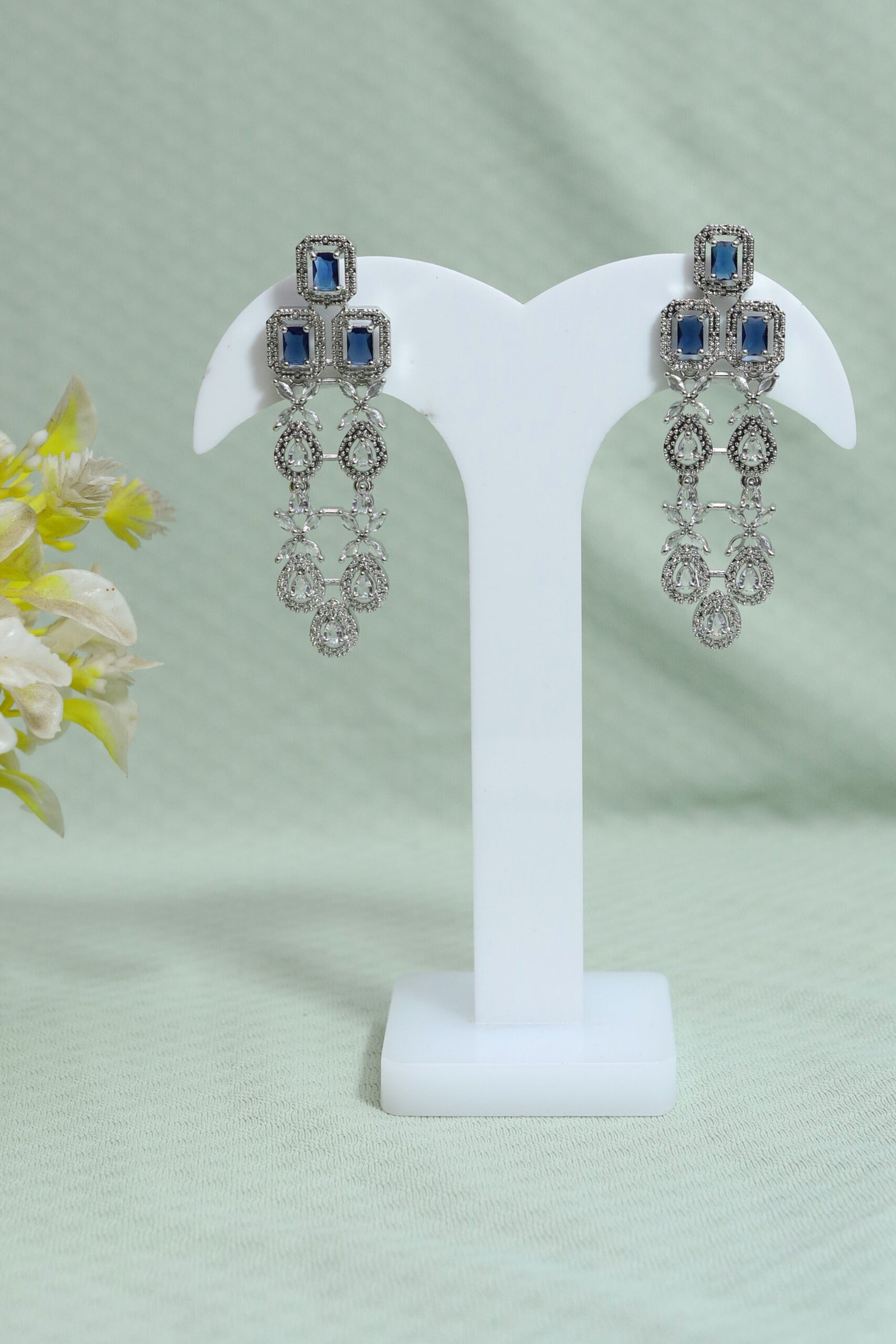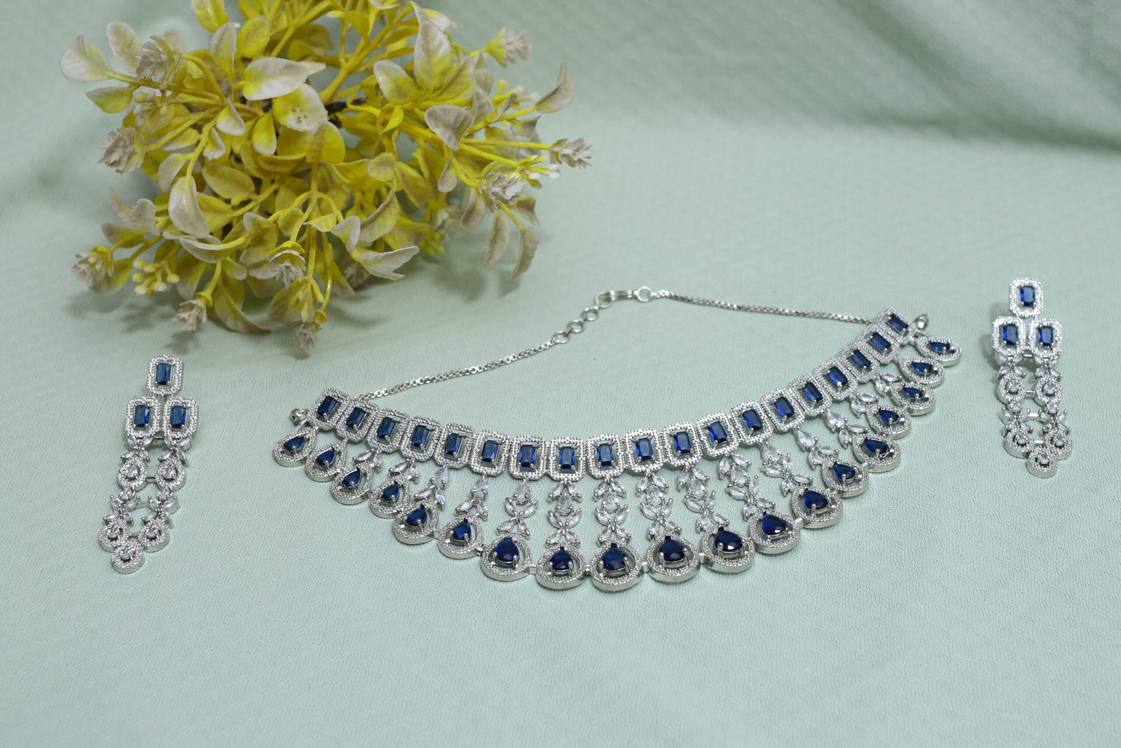 The necklace sits gracefully along the neckline, reflecting light with every movement, while the coordinated drop earrings enhance the overall sophistication of the ensemble.