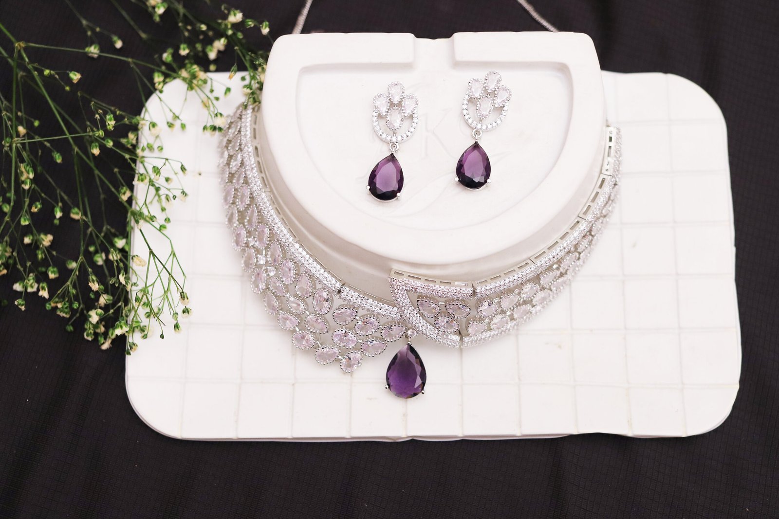 The highlight of the design is the rich amethyst-purple teardrop stone at the center, adding a royal touch and graceful contrast to the sparkling crystal setting. The delicate craftsmanship and elegant detailing give this set a refined and feminine appeal.