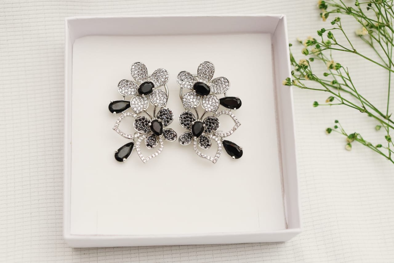 Crafted in a delicate flower-inspired pattern, these earrings feature shimmering American diamonds paired with bold teardrop stones that create a striking contrast and elegant finish.