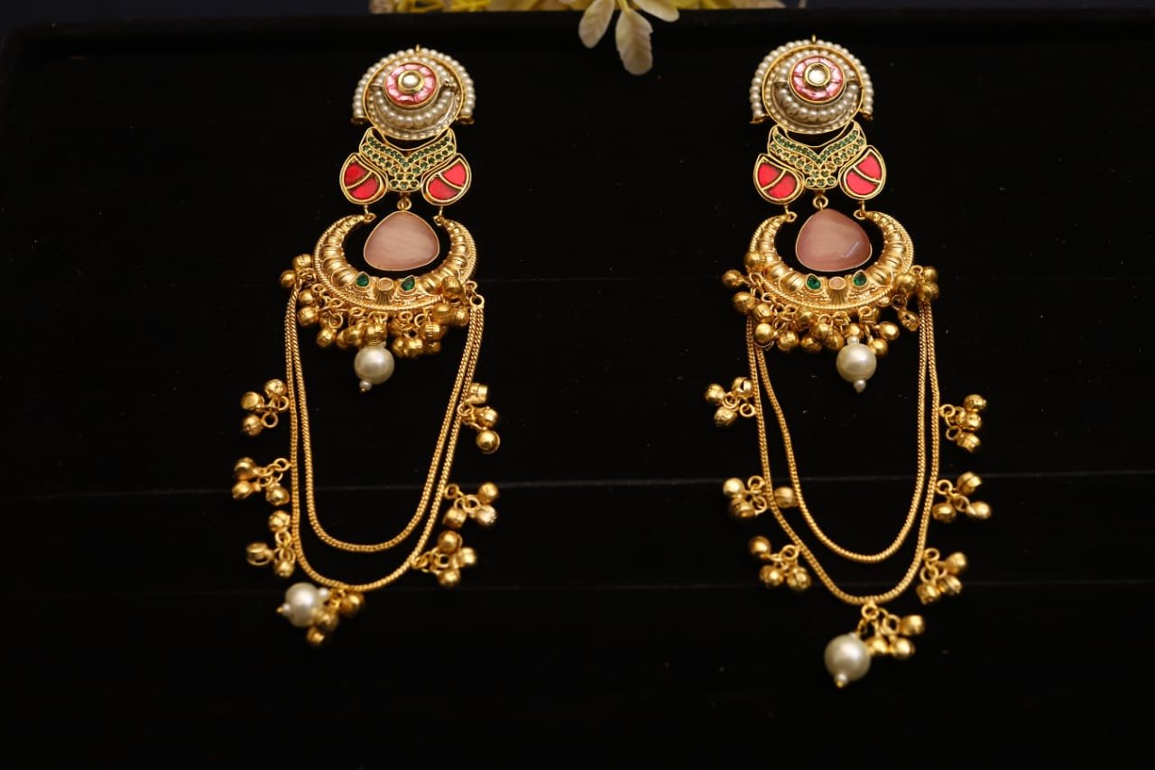 Enhance your traditional style with these Antique Gold-Toned Kundan & Ruby Drop Earrings. Featuring an elegant teardrop-shaped Kundan stud at the top, the design flows into a beautifully detailed dome motif adorned with sparkling stones and ruby accents.