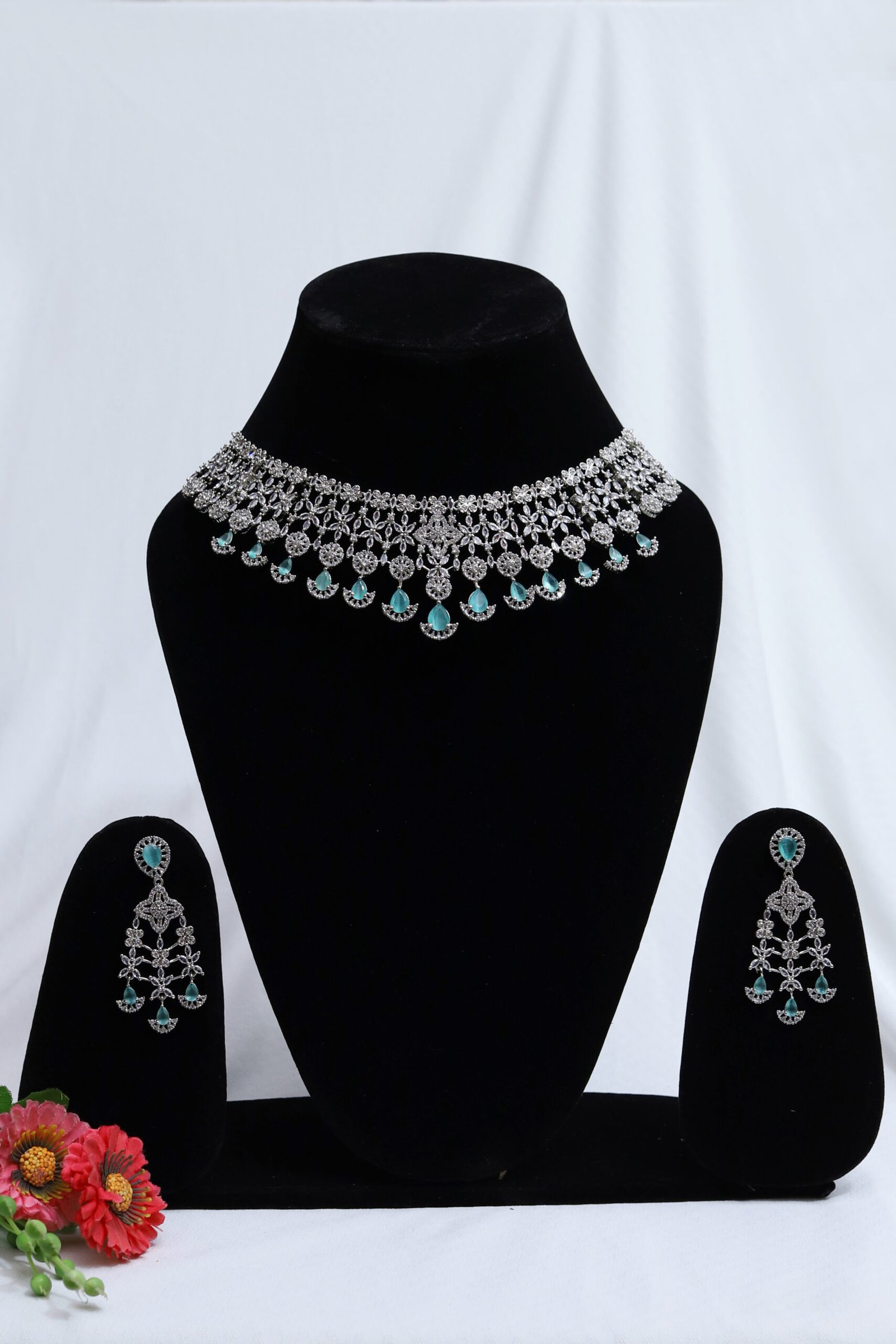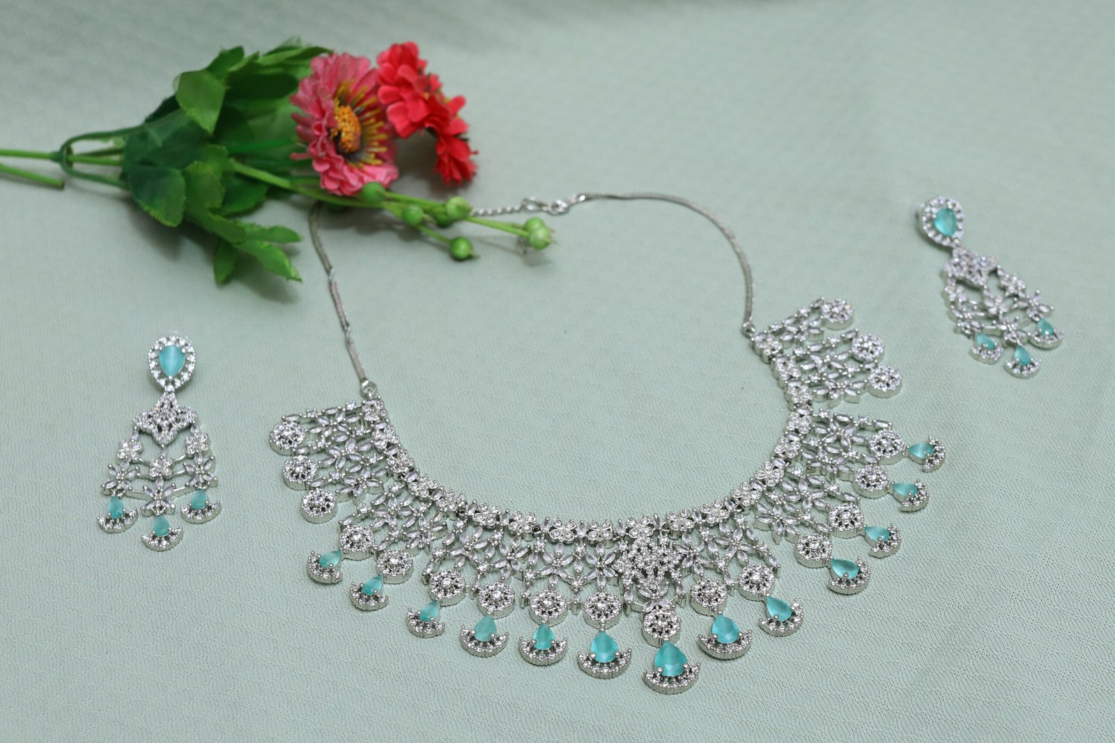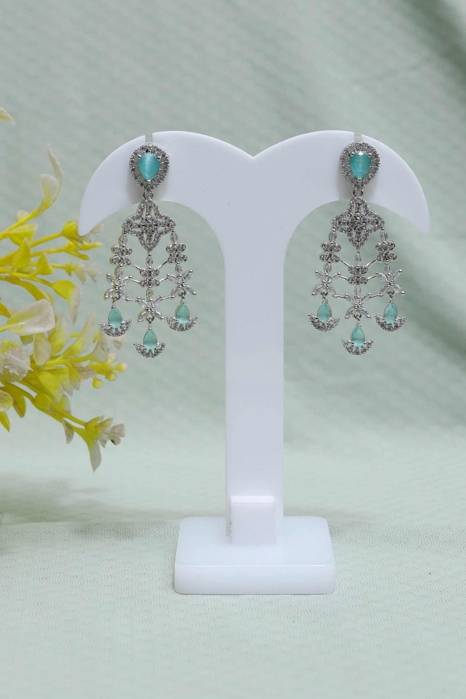 • Earrings: Matching drop earrings with similar crystal and aqua detailing